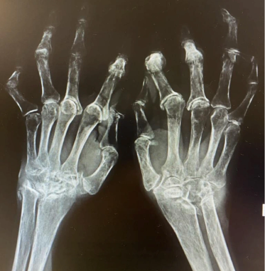 La articulación se ve hinchada, caliente y enrojecida. Puede afectar a una o varias articulaciones, y a menudo de forma simétrica (por ejemplo, en ambas manos).